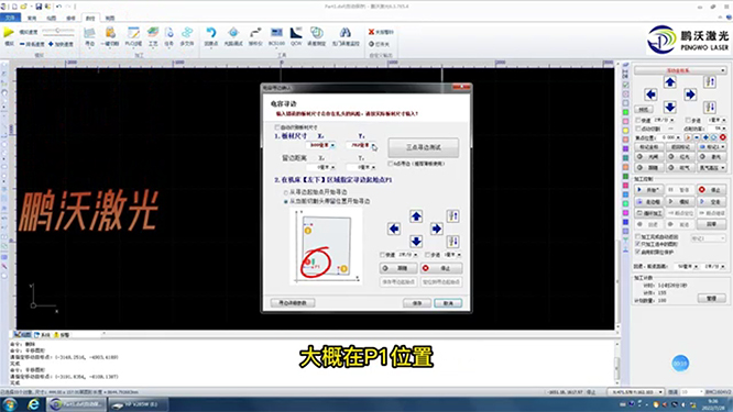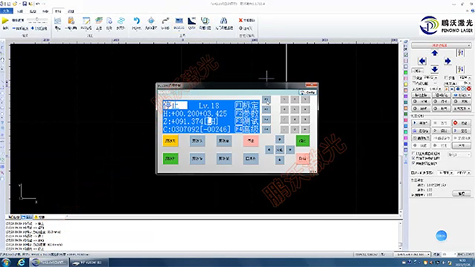 首先將我們需要打標的字,或圖形導入在切割軟件中,在這里我們演示打標“鵬沃激光”,將需要打標的字選成紅色工藝,修改工藝參數,以2000瓦激光器為例。。。。